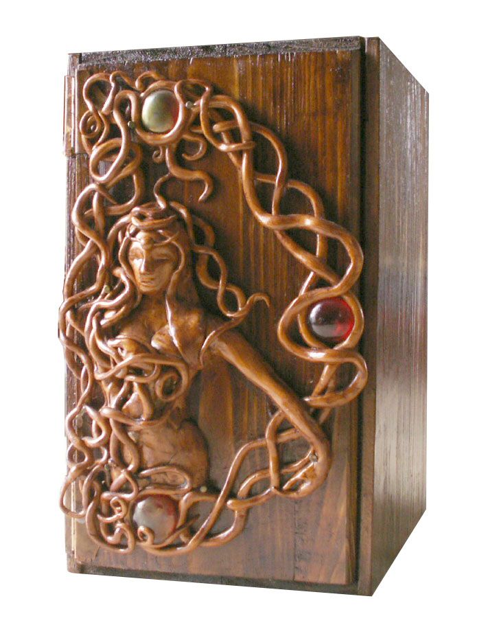 Couleur et patine réalisées par mes soins. Décor en pâte fimo et galets de verre créé par moi d'après le motif du lit de Frodon à Foncombe (sur une idée d'Alan Lee)